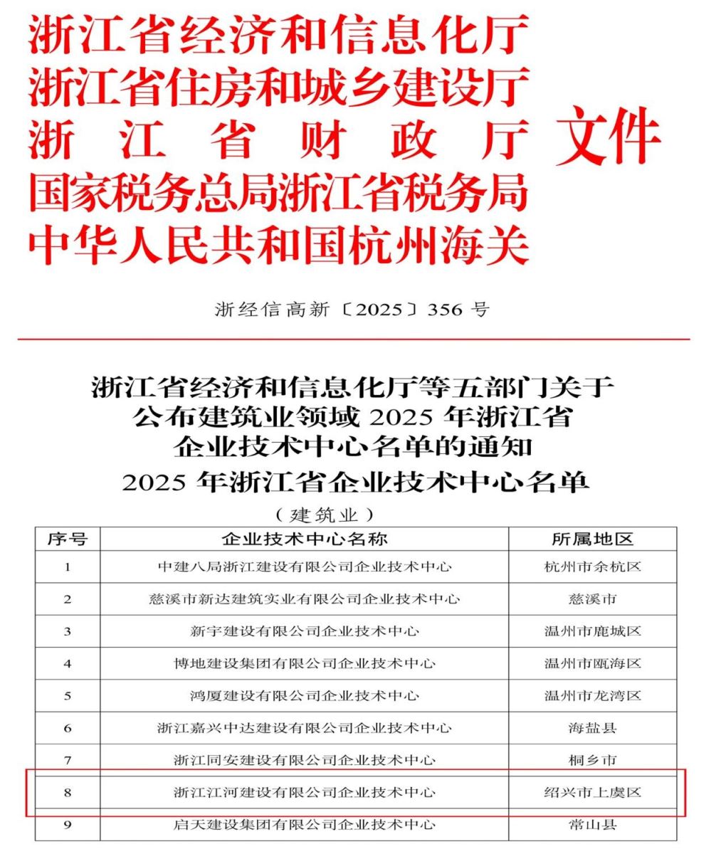 12月26日,浙江省經濟和信息化廳等五部門聯合發布了建筑業領域 2025 年浙江省企業技術中心獲評名單,公司成功上榜。